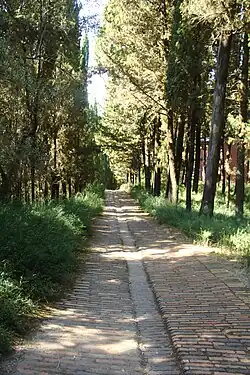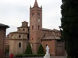 Za palácem se táhne dlouhá cypřišová alej, podél níž se nachází botanická zahrada staré lékárny, zničené v roce 1896, rybník z roku 1533 a několik kaplí: Madonna dell'Onigo, San Benedetto, San Bernardo Tolomei, Santa Croce, Santa Francesca Romana a Santa Scolastica. Na konci aleje se nachází zvonice v románsko-gotickém slohu a apsida kostela s gotickou fasádou; v prostoru apsidy byla v roce 2009 umístěna socha svatého Bernarda Tolomei od Massima Lippiho. Dveře napravo od vchodu do kostela vedou do křížové chodby Chiostro Grande.