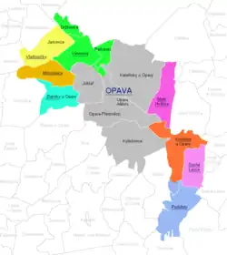 V letech 1976–1991 byla součástí města i obec Chvalíkovice.[17] Většina území města leží historicky ve Slezsku, ale čtyři z jeho částí (Kravařov, Suché Lazce, Vlaštovičky a Jaktař) patřily k tzv. moravským enklávám ve Slezsku.[22]