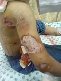 Patnáctiletý palestinský chlapec Ajman popálený při izraelském bombardování bílým fosforem