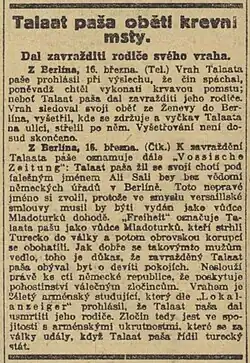 ![]() Talat Paša zavražděn na berlínském předměstí (New York Times, 16. března 1921) | |