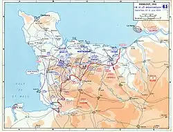 Samotné vylodění bylo úspěšné, ale nyní bylo nutné prorazit z Normandie, osvobodit Bretaň a následně postupovat do vnitrozemí, směrem k Paříži. Aby toho Spojenci dosáhli, rozhodl se generál Eisenhower rozdělit Normandii do dvou sektorů: britského a kanadského na východě a amerického na západě. Šlo o to, aby Britové a Kanaďané na východě vázali německé tankové divize, které se přemisťovaly z Pas-de-Calais, zatímco Američané na západě obsadí poloostrov Cotentin s přístavním městem Cherbourg a prorazí do Bretaně. Dalším důležitým strategickým cílem se stalo město Caen v britském sektoru. Jako největší Normandské město bylo Caen důležitou strategickou křižovatkou v oblasti. Němci však ve městě a jeho okolí drželi až osm pancéřových divizí a sedm pěších divizí, a tak se stalo, že i když mělo být Caen dobyto už 6. června, protáhly se boje o město na dlouhé dva měsíce. Američané však nyní měli volné ruce a mohli se pokusit o průlom z Normandie.