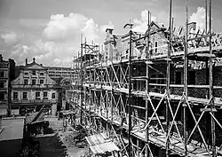 V říjnu 1944 bylo Opolí prohlášeno za pevnost (Festung Oppeln) a mělo se stát jedním z opěrných bodů německé obrany na linii Odry. Nakonec se bitva o Opolí nekonala, německé jednotky, jež neobdržely slíbené posily, se před postupující Rudou armádou stáhly na levý břeh Odry a velitel obrany Friedrich-Albrecht Graf von Pfeil spáchal sebevraždu.[19] Pravobřežní čtvrti byly obsazeny v noci na 24. ledna 1945, následně se fronta zastavila a přes řeku se Sověti dostali až mezi 15 a 19. března.[20][9] V důsledku bojů, amerického bombardování v prosinci 1944, ale i plundrování města sovětskými vojáky v prvních poválečných týdnech došlo ke zničení 25 % zástavby.[21] Při obnově zničeného historického jádra v 50. letech se uplatnily ideologické principy – nové domy okolo hlavního náměstí (Rynek) byly záměrně stylizovány do barokní podoby „z dob před pruským panováním“ a některé z prestižních důvodů navýšeny o jedno patro oproti svým předchůdcům.[22] Ve vedlejších uličkách Starého Města vznikly úsporné socialistické bytovky a eklektickou architekturu Krakauer Straße (ulice Krakowska), spojnice mezi historickým jádrem a nádražím a nyní hlavní pěší zóny, částečně nahradila paneláková zástavba.