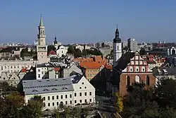 - Piastovská věž (Wieża Piastowska) – okrouhlá 42 m vysoká (bez jehlanovité střechy 35 m) gotická věž ze 14. století ušetřená při demolici knížecího hradu v letech 1928–1931 díky občanským protestům; v současnosti slouží jako rozhledna a během rekonstrukce v letech 2011–2014 byla uvnitř instalována multimediální historická expozice;