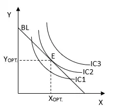 Optimum spotřebitele v ordinalistickém pojetí je graficky znázorněno bodem rovnováhy (E), tedy bodem, kde se linie příjmu dotýká nejvýše položené indiferenční křivky.[6]