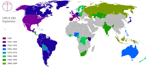 Během druhé světové války se zakladatel přestěhoval do Říma, jelikož si byl vědom nutnosti sídla v tomto městě pro další expanzi do celého světa. V následujících letech cestoval po celé Evropě, aby připravoval započetí práce Opus Dei v různých zemích. V roce 1946 začala tato práce v Portugalsku, Itálii, Anglii, Irsku a Francii. Do Československa Opus Dei přišlo v roce 1990.
