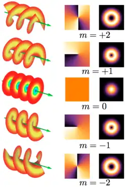 pro jisté číslo a amplitudu , kde musí vyhovovat paraxiální vlnové rovnici. Má-li být toto pole spojité ve všech bodech, musí platit , z čehož plyne, že a tak musí být celé číslo. Fáze pole je určena exponentem ve členu a je tak rovna pro daný úhel , nezávisle na hodnotě souřadnic a . Vykreslíme-li si výraz jako funkci všech tří cylindrických souřadnic, je výsledný graf této funkce tvaru šroubovice. Z tohoto důvodu se vlnoplochy výše uvedeného pole označují jako šroubovicovité vlnoplochy (anglicky: helical wavefronts)[pozn. 3]. Paraxiální rovnice nám pro tato pole říká, že -ová složka celkového momentu hybnosti svazku (vztaženého na jednotkovou vzdálenost) je rovna[1][10]