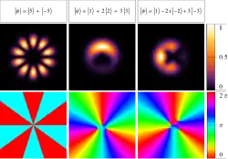 Profil intenzity a fáze pro vlnovou funkci, která vznikne superpozicí různých OAM módů, může být jednak velmi komplikovaný, jednak se může vyznačovat různým počtem fázových nespojitostí. OAM módy mohou mít jak kladnou tak zápornou hodnotu a koeficienty v superpozici mohou být nejen reálná, ale i komplexní čísla. Na obrázku vpravo je výběr tří různých superpozic, z nichž hned ta první, odpovídající stavu [pozn. 10], je příkladem specifické třídy stavů, jež jsou obecně tvaru