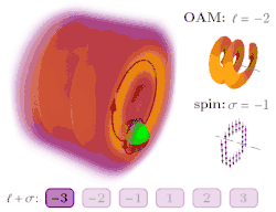 Jak plyne z diskuze nalevo, celkový moment hybnosti záření sestává ze dvou složek (alespoň v paraxiální aproximaci). Obě složky momentu hybnosti mají různé vlastnosti a rozdíl mezi nimi lze patrně nejsnáze nahlédnout ze způsobu, jakým tyto složky interagují s hmotnými předměty. V animaci níže je zobrazen krátký úsek světelného svazku, do něhož je vložena kulička, na níž světelný svazek působí oběma složkami momentu hybnosti. ![]() Spin, neboli vlastní moment hybnosti, odpovídá kruhové polarizaci světla a pro fotony nabývá hodnot , kde je redukovaná Planckova konstanta. K přenosu spinu dochází, prochází-li světlo dvojlomným materiálem jakým je třeba vlnová destička. Působení spinu na malou částečku se projevuje její rotací kolem vlastní osy — částečka rotuje na jednu stranu pro spin s , na stranu druhou pro a pokud je paprsek světla polarizován lineárně, což odpovídá superpozici obou hodnot, přestane se částečka točit. Tento případ lze vyjádřit jako . Namísto toho orbitální moment hybnosti nabývá pro svazky se šroubovicovitou fází hodnot pro libovolné celé číslo . K přenosu orbitálního momentu hybnosti dochází při průchodu optickým prvkem, jehož tvar není souměrný vůči ose svazku a různá místa svazku tak obdrží průchodem různou fázi. Jednoduchým příkladem takového prvku je válcová čočka[1]. Působení orbitálního momentu hybnosti se projevuje rotací částice kolem osy svazku[2]. Celkový moment hybnosti každého fotonu ve svazku je roven . V animaci jsou pro jednoduchost zobrazeny svazky jen pro dvě hodnoty: a . Tabulka pod rámečkem shrnuje některé zásadní rozdíly mezi oběma složkami momentu hybnosti. |