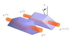 kde s jsou po řadě poloměry svazku v -ové a -ové souřadnici. Pokud jsou tyto poloměry totožné, zredukuje se výše uvedený vzorec do tvaru pro standardní gaussovský svazek. Nechá-li se eliptický svazek procházet válcovou čočkou natočenou o nenulový úhel vůči -ové ose, dojde k astigmatismu. Ukazuje se[44], že v takovém případě obdrží každý foton eliptického svazku orbitální moment hybnosti o velikosti
