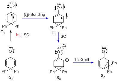 Obdobou přeměny santoninu na lumisantonin je přesmyk 4,4-difenylcyklohexadienonu.[9] V tomto případě n-π* tripletový excitovaný stav prochází stejnou beta-beta reakcí. Následně se vytvoří singletový zwitterion v základním stavu. Posledním krokem je přesmyk, kterým vzniká bicyklická sloučenina. Reakce patří mezi cyklohexadienonové přesmyky typu A.