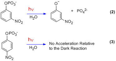 V roce 1956 byla provedena reakce, při které proběhla fotolýza nitroskupiny v poloze meta namísto obvyklé aktivace v polohách ortho a para.[5]