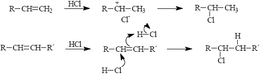 Adice halogenovodíků HX (X=F,Cl,Br,I) na alkeny a alkyny byla široce studována jak z mechanického hlediska, tak z praktického hlediska. Její význam je však limitován nežádoucími vedlejšími reakcemi. Snadnost adice halogenovodíků na jednoduché alkeny je v souladu s jejich klesající aciditou HI > HBr > HCl > HF. Adice obvykle probíhají regioselektivně a řídí se polarizací násobné vazby.