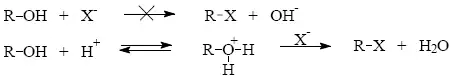 Substituce kyslíkatých funkčních skupin. Nejběžnějšími edukty halogenderivátů jsou odpovídající alkoholy. Protože hydroxyskupina je v nukleofilních substitucích skupinou špatně odstupující, musí se nejdříve aktivovat.