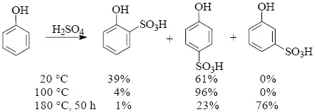 Sulfonace aromatických sloučenin je mnohostranně využitelná reakce a podléhá jí většina aromatických systémů včetně kondenzovaných. Na reaktivitě substrátu - analogicky jako při nitraci - závisí volba činidla. Sulfonace je z elektrofilních aromatických substitucí výjimečná v tom, že je vratná a sulfoskupinu je možno z molekuly aromatické sloučeniny opět odstranit. Dalším fenoménem sulfonace je možnost ovlivnit distribuci produktů kinetickým nebo termodynamickým řízením reakce. Tuto skutečnost lze dokumentovat na příkladu sulfonace fenolu koncentrovanou kyselinou sírovou.