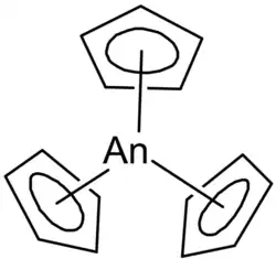 Většina trojmocných kovů bloku f vytváří sloučeniny s cyklopentadienem o obecném vzorci M(Cp)3. Tyto komplexy byly izolovány u prvků po kalifornium a příslušná sloučenina einsteinia byla pozorována v plynné fázi.[13]