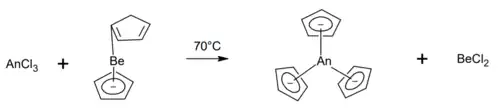 AnCp3 se obvykle připravují podle výše uvedeného schématu,[4][14] někdy se přidává několik dalších kroků potřebných k přípravě chloridů z dodávaných oxidů.[13] Lze použít i jiné postupy, například komplexy beryllia je možné nahradit cyklopentadienidy alkalických kovů a komplexy čtyřmocných aktinoidů mohou být získány také redukčními eliminacemi.