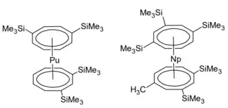 Plutonium také vytváří sendvičový komplex s 1,4-bis(trimethylsilyl)cyklooktatetraenylovým iontem (1,4-COT’’) a jeho 1,3-izomerem. Tyto sloučeniny se získávají oxidací aniontových, zelených, plutonitých komplexů Li(THF)4[Pu(1,4-COT’’)2] chloridem kobaltitým za vzniku Pu(1,4-COT’’)(1,3-COT’’). Průběh reakce lze snadno zaznamenat, protože tetrahydrofuranový roztok změní barvu na tmavě červenou, běžnou u plutoničitých sloučenin.[10]