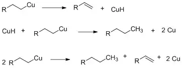 Tepelné dimerizace probíhají za přítomnosti hydridů mědi, přičemž se zachovává konfigurace organoměďné sloučeniny.[8]