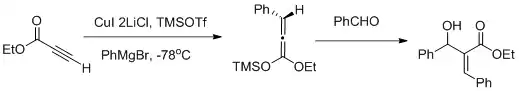 Byla mimo jiné popsána vicinální funkcionalizace α,β-acetylenových esterů karbokuprační reakcí s Mukaijamovou aldolovou adicí, při níž převažuje tvorba Z-aldolu.