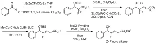 - ↑ Okada, M.; Nakamura, Y. Sago, A.; Hirokawa, H.; Taguchi, T. Stereoselective construction of functionalized (Z)- fluoroalkenes directed to o- depsipeptide isosteres. Tetrahedron Letters 2003, 43, 5845-5847.