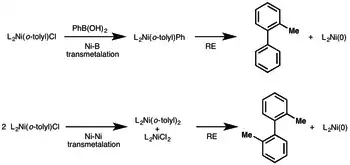 Tvorba organoniklových sloučenin takovými reakcemi nemusí být zřejmá, ale vhodně navrženým experimentem lze kvantitativně potvrdit tvorbu dvou meziproduktů:[10]