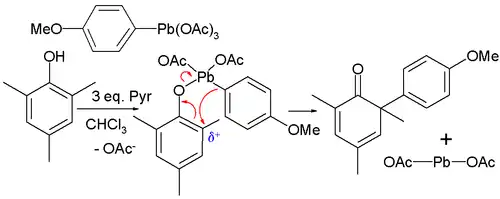 - CH3OC6H5 + Pb(OAc)4 → CH3OC6H4Pb(OAc)3 + HOAc
