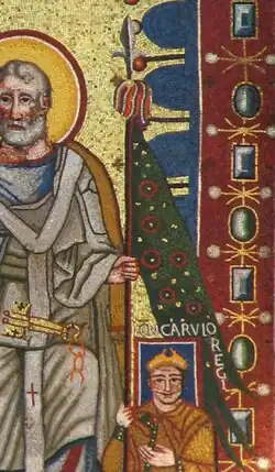 Oriflamme patřící (dle mozaiky) byzantskému císaři Konstantinovi VI. (není známo, že by ho Byzanc používala)