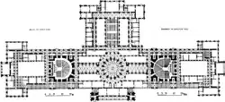 Uskutečněný návrh byl v novogotickém stylu. Jako vzor posloužil Westminsterský palác, sídlo britského parlamentu v Londýně.[8] Jsou zde ale i prvky baroka a renesance. Barokní je půdorys stavby, venkovní prvky mají historizující podobu a odkazují na gotiku a na renesanci odkazuje výtvarná podoba stropů. Hlavní inspirací pro Steindla byla nicméně vídeňská novogotika, a to v podobě od Friedricha von Schmidta. Až na několik ze Španělska dovezených červených mramorových bloků se podařilo splnit závazek, že vše vznikne z kamene a dalších materiálů domácí provenience.