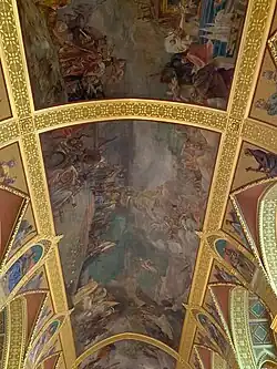 Vnější stěny jsou zdobeny 88 plastikami[7] maďarských náčelníků a králů, sedmihradských vojvodů, významných vojevůdců a dalších, kteří pozvedají zrak k 96 metrů vysoké kopuli, jež se tyčí nad symetrickými křídly budovy.[17] Fresky v zasedacím sále zobrazují historický sněm z roku 1848 a korunovaci Františka Josefa I. roku 1867.[18]