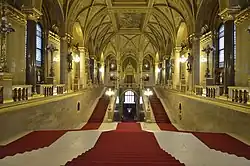 Po stranách hlavního schodiště vítají návštěvníky dvě sochy lvů. Skrz vstup lze vstoupit do haly Díszlépcső-csarnok („Ozdobných schodů”). Zde se nachází i bronzová busta architekta Steindla instalovaná v roce 1904. V této hale se nalézá i osm sloupů z červeného mramoru. Šest metrů vysoké sloupy původem ze Španělska jsou jedinečné v celé Evropě. V hale můžeme vidět množství maleb a malé sošky držící korunovační klenoty. Přes tuto halu se dostaneme do kupole.
