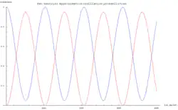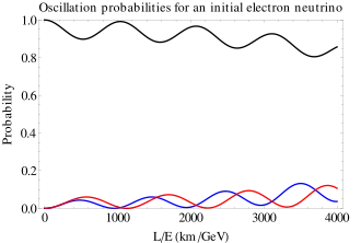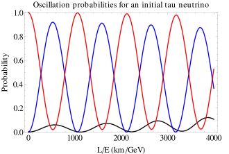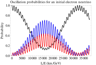 Oscilace elektronových neutrin. Závislost pravděpodobnosti naměření vůně neutrina v závislosti na vzdálenosti. Černě je značena pravděpodobnost pro , modře pro a červeně pro .Oscilace mionových neutrinOscilace tauonových neutrinOscilace elektronových neutrin na delší prostorové škále. Zde jsou viditelné i dominantní oscilace mezi elektronovým a mionovým stavem.