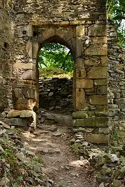 Na druhém nádvoří volně stojí okrouhlý bergfrit, jehož přízemní vstup byl proražen až v devatenáctém století.[7] Také hradba druhého nádvoří obíhá jádro jako další parkán. Na západní straně k ní byla v 15. století přistavěna hospodářská budova považovaná za pivovar,[2] nebo ubikaci posádky.[8] Na prvním nádvoří stála zřejmě jen protáhlá brána. Hradby prvního a druhého nádvoří postrádaly ochoz a jejich obranu umožňovaly pravidelně rozmístěné věžičky. Existuje názor, že vnější opevnění nevzniklo současně se založením hradu, ale bylo postaveno až v průběhu 14. století.[2][9]