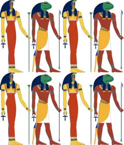 - Tenemu a Tenemut jako neuspořádanost, kteří ovšem byli v průběhu Střední říše nahrazeni Amonem a Amaunetou vyjadřujícími princip skrytosti (podle Harta skrytého dynamismu[2]), případně reprezentujícími vše dosud neviditelné.[10] V Pozdní době se někdy na místě čtvrtého páru objevují Gerh a Gerhet chápaní jako vyjádření hloubky noci.