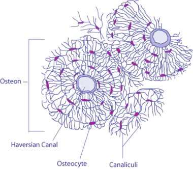 Osteon má tvar dlouhého válce, je tvořen 4-20 koncentrickými lamelami. Vnější průměr mívá okolo 200 µm, jeho dlouhá osa leží rovnoběžně s dlouhou osou kosti.[1] Každý osteon je obklopen amorfním materiálem, cementovou substancí (mineralizovaná matrix s malým množstvím kolagenních vláken).[2] Haversův kanál uvnitř osteonu je na vnitřní ploše lemován endostem. Obsahuje krevní cévy, nervová vlákna a řídké kolagenní vazivo. Kanál komunikuje s periostem, s kostní dření i s ostatními Haversovými kanály příčnými nebo šikmými kanály Volkmannovými.[1] Volkmannovy kanálky nejsou koncentrickými lamelami obaleny, nýbrž jimi pronikají.[3] Přivádějí cévy a nervy z periostu k Haversovým kanálům.[1]