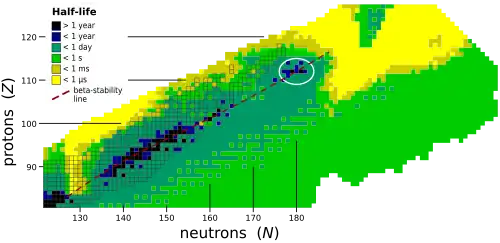 (Poznámka: Pro prvky 108–118 je nejstabilnější známý izotop vždy ten nejtěžší nebo druhý nejtěžší (115) dosud známý. Proto je pravděpodobné, že mezi těžšími neobjevenými izotopy těchto prvků existují ještě stabilnější izotopy.)
