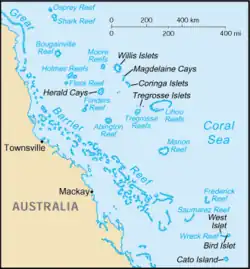 - ↑ a b Geoscience Australia - Fab Facts, Dimensions, External Territories, Coral Sea Islands. web.archive.org [online]. 2006-08-21 [cit. 2022-04-13]. Dostupné v archivu pořízeném z originálu dne 2006-08-21.