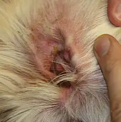 - Otitis externa je zánět zvukovodu. Projevuje se bolestí a svěděním, to způsobuje, že si zvíře drbe postižené místo, naklání hlavu na jednu stranu a jeho ucho je citlivé na dotek. Obvyklé zarudnutí v horizontálním kanále je zjistitelné jen za pomoci otoskopu. V pokročilejší fázi dochází ke zvýšené tvorbě mazu, objevuje se typický zápach, v oblasti zvukovodu vzniká otok a začínají se tvořit strupy nebo šupinky.[3]