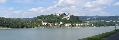 Pohled na zámek Ottensheim z protějšího břehu Dunaje