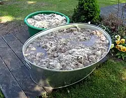 Surová, potní vlna[2] obsahuje v průměru jen méně než polovinu váhového množství spřadatelných vláken, 10–45 % je tuk a pot, 5–20 % jsou nečistoty, které se dostaly do srsti na pastvině, mimo toho mohou vlákna pojmout až 25 % vlhkosti. Tuk a pot se odstraňuje praním (získaný lanolin se dá použít v kosmetice) a rostlinné příměsi se karbonizují (karbonizace vlny) kyselinou sírovou (zuhelnatí).