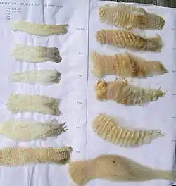 - Pro posouzení jakosti vlny je důležitá délka, pevnost, obsah rostlinných příměsí, barevný odstín a rozhodující je jemnost vlákna. Jemností se v současné době rozumí tloušťka vlákna v průřezu měřená v mikrometrech (µm). Asi do konce 20. století se jemnost označovala také podle tzv. „bradfordského systému“ číslem výpředu (spinning count / wool grade)[4]
