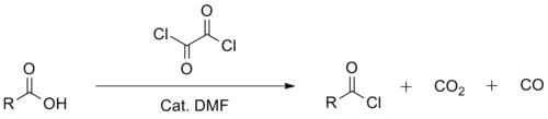 Oxalylchlorid se nejčastěji používá společně s N,N-dimethylformamidem (DMF) jako katalyzátorem v organické syntéze k přípravě acylchloridů. Podobně jako thionylchlorid se při této reakci mění na těkavé vedlejší produkty; jeden z menšinových vedlejších produktů je možný karcinogen.[4] Oproti thionylchloridu je mírnějším a selektivnějším reaktantem; je rovněž dražší a tak se většinou používá v menším měřítku.