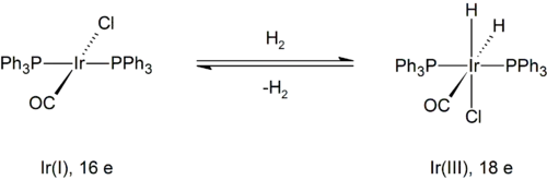 Příkladem je reakce vodíku s Vaskovým komplexem (trans-IrCl(CO)[P(C6H5)3]2). Oxidační číslo iridia se zde mění z +1 na +3. Produkt je navázán na tři anionty: jeden chloridový a dva hydridové ligandy. Původní komplex měl 16 elektronů a koordinační číslo 4, zatímco produkt má 18 elektronů a koordinační číslo 6.