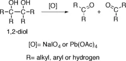 Alkoholy s dvěma hydroxylovými skupinami na sousedních uhlících, nazývané vicinální dioly nebo 1,2-dioly, při oxidacích činidly jako jsou jodistan sodný (NaIO4), (diacetoxyjod)benzen (PhI(OAc)2)[3] nebo octan olovičitý (Pb(OAc)4) štěpí vazby mezi uhlíkovými atomy, na které jsou hydroxyly navázány, což vede ke vzniku dvou karbonylových skupin. Tato reakce se nazývá glykolové štěpení.