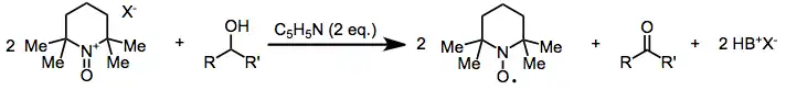 Za neutrálního nebo mírně kyselého pH se oxidace uskutečňuje na vodíkové vazbě mezi hydroxylovou skupinou a oxoamoniovým dusíkem, po čemž následuje přenos protonu a odštěpení hydridu.[5] Mechanismus oxidace za slabě zásaditých podmínek (například v pyridinu) je podobný, zásada pouze neutralizuje hydroxyamonné ionty a takto vytvořený meziprodukt se synproporcionuje s oxoamonnou solí na nitroxidové radikály a pyridiniovou sůl (viz rovnici (3) níže). Protože se při reakci spotřebovává zásada a aktivní oxidant, tak jsou v zásaditém prostředí potřeba dva ekvivalenty každé z těchto látek. V roce 2015 byl popsán jednotný mechanismus pro neutrální a mírně zásaditá prostředí.[6]