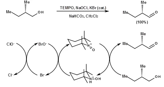 Katalytické oxidace katalyzované oxoamonnými solemi mohou být uskutečněny s chlornanem sodným. Hodnota pH se musí udržovat pod 10 pomocí pufru. Aktivním oxidačním činidlem je bromnanový anion, z tohoto důvodu se do reakční směsi přidává bromid draselný.[3] U produktů obsahujících karbonylové skupiny nebyla pozorována žádná epimerizace α-stereogenních center.