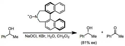 Enantioselektivní oxidace se obvykle provádějí pomocí kinetického rozlišení chirálních alkoholů nebo desymetrizačními reakcemi. Lze jich dosáhnout použitím chrálních nitroxidových katalyzátorů; příkladem může být kinetické rozlišení racemického 1-fenylethanolu.[9] Oxidační desymetrizace se provádějí s oxoamonnými oxidanty a jsou vzácnější.[10]