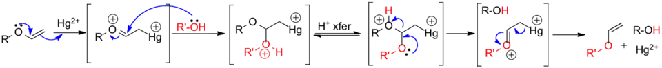 Při reakcích vinyletherů za přítomnosti alkoholů se nahrazují alkoxyskupiny (RO–) jinými, přičemž takové reakce probíhají přes acetalové meziprodukty. Allylalkoholy s vinylethery dávají sloučeniny s obecným vzorcem R–CH=CH–CH2–O–CH=CH2, vhodné k zaojení do Claisenových přesmyků.[8]