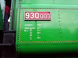 - Druhá a třetí velká číslice označuje objem vodní nádrže v m³. (Tendr na vedlejším obrázku má vodní nádrž o objemu 30 m³.)