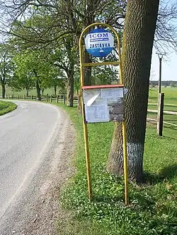 Dvoutyčový zastávkový sloupek ČSAD, zde upraven pro ICOM transport. Žirovnice, rozcestí k Častrovu.