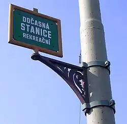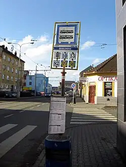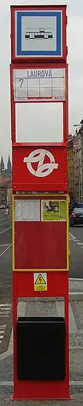 • Tabulka nebo obdobné označení s názvem zastávky (kolmo na podélnou osu zastávky). Může být doplněna označením druhu zastávky (na znamení, stálá, občasná), tarifního pásma nebo podobnými údaji.